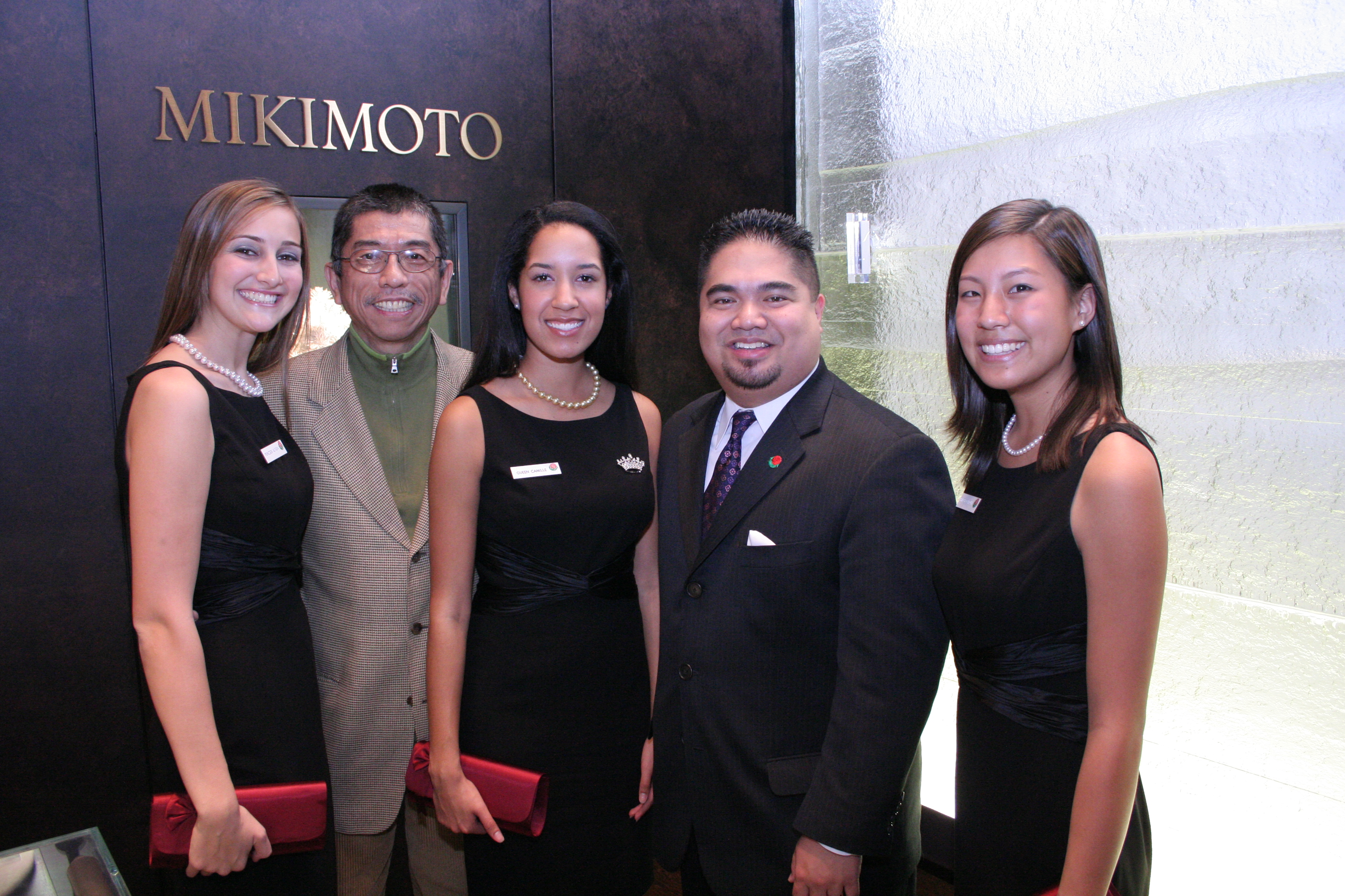 Shown here from left to right are: Rose Princess, Alyssa Jones, Tadashi Shoji, Designer/President/CEO of Tadashi, Rose Queen, Camille Clark, Bernard Barbilla, Mikimoto Store Manager of Beverly Hills, and Rose Princess Carolyn Loo.